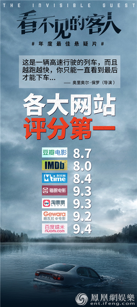电影《看不见的客人》已于9月15日内地公映。影片早先在IMDb获得8.0分好评,自内地公映以来,影片猫眼评分9.4分、淘票票评分9.3分、百度糯米9.4分,豆瓣平台更是从映前的8.6分涨至8.7分。各平台评分持续看涨,影片凭借超强的口碑持续发力后劲十足。不少影迷感叹:“终于在内地银幕上看到了如此高规格的悬疑片。”