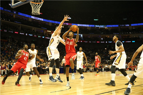 10月9日,在NBA季前赛上海站的比赛中,火箭队以123∶117击败鹈鹕队。