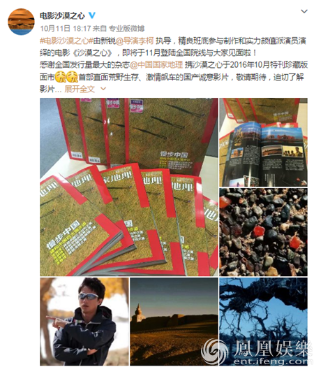 中国发行量最大的杂志《中国国家地理》2016年10月特刊珍藏版,立足于《沙漠之心》取景地内蒙古阿拉善右旗的大量写实镜头,以漫步中国为主题重点推荐,再现《沙漠之心》的宏大叙事背景。中国国家额济纳的胡杨林、黑水城的黑古堡、腾格里沙漠的天鹅湖,居延海,红嘴鸥,以及巴丹吉林的黑沙暴等,画面精致大气,气氛营造诡秘又华美。电影不仅将这些仙境一般的美景尽收其中,更是令其在荒野求生的主题下透出一种绝望之美。