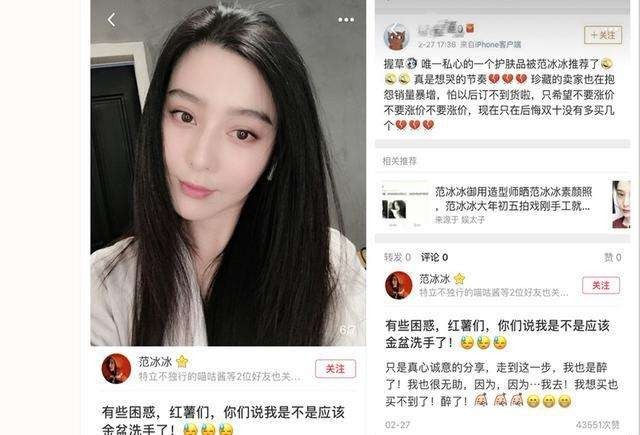 在圈内,明星带货早已不是什么新闻,纷纷化身美妆博主、时尚博主。网传范冰冰自创的面膜品牌登陆天猫一个月内就售出10万盒。就连近日在西藏参加公益活动时,出现高反的范冰冰也不忘给自己代言的面膜打广告,带货能力十足。
