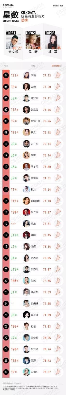 据了解,真正网红“带货”变现是在2017年双十一时,网红主播带货以惊人效果席卷电商界,无数网红店铺销量暴增。随后明星带货更成为电商领域的现象级。明星带货到底哪家强?5月20日,第一财经商业数据中心(CBNData)发布了星数——2019一季度“CBNData星数明星消费影响力榜”,余文乐、吴昕、杨幂排名TOP3,更有百位明星上榜。不论是综艺节目,影视剧,还是个人社交账号上,明星们都展现强劲的吸金能力。