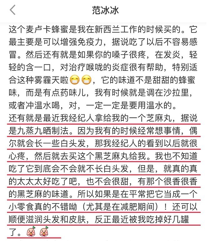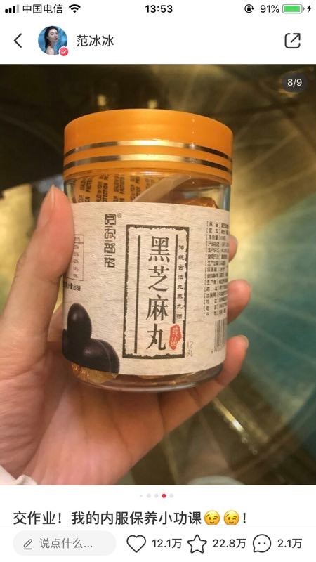 至少早在去年,当时还热度未减的范冰冰也曾在某平台安利过黑芝麻丸。当时,范爷在其推文中自曝“内服保养秘方”,更是码字一整段讲述经纪人怕自己“早生白发”而特意买来黑芝麻丸,并直言效果好,已经吃掉好几罐。